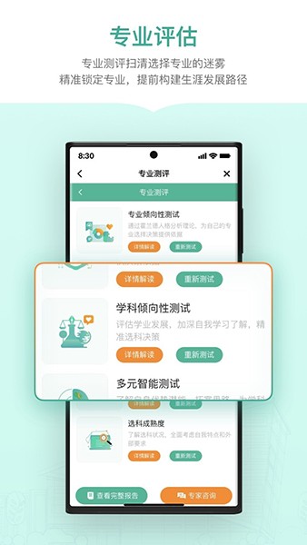 3、在专业测评中,可以通过扫清选择专业的迷雾,精准锁定适合自己的专业。