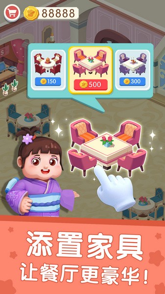 - 按照你喜欢的风格装扮餐厅,贴墙纸、换桌椅、铺地毯,让餐厅更华丽。