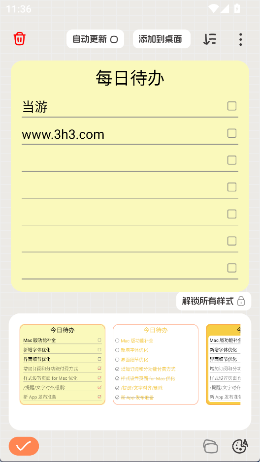 桌面便签是一款轻量待办事项管理工具,创建每日任务清单后,通过桌面小组件实现快速查看与操作,用直观形式展示在手机桌面上,方便随时掌握当日计划,无需频繁打开主程序即可完成任务勾选或添加,简化任务管理流程、提升日常效率。
