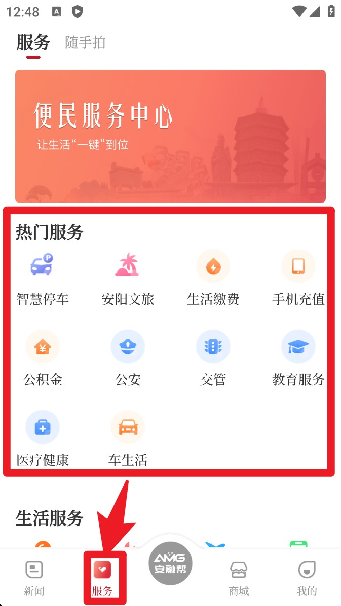 2. 点选底部导航栏中的服务按钮,即可查找常用项目如生活缴费、教育服务、公积金等入口。