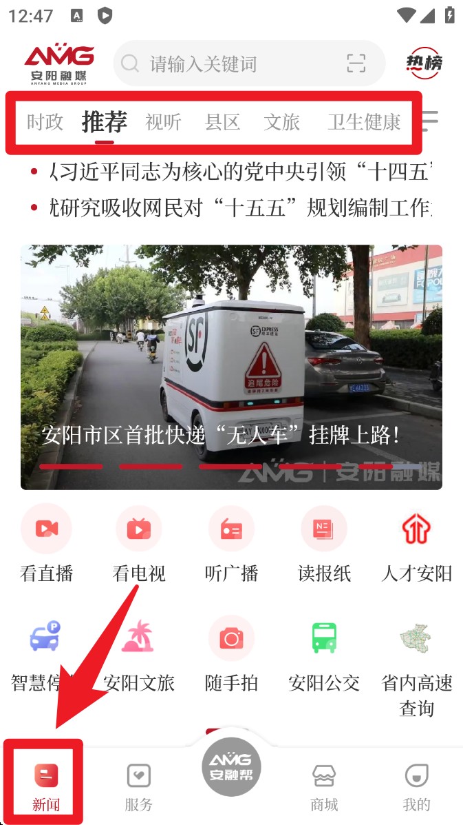 1. 进入App后默认显示新闻页面,可点击页面顶部标签切换时政、文旅等栏目,浏览最新本地新闻与推送资讯。