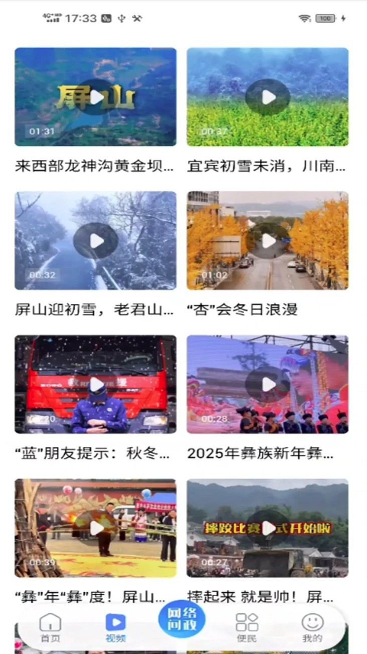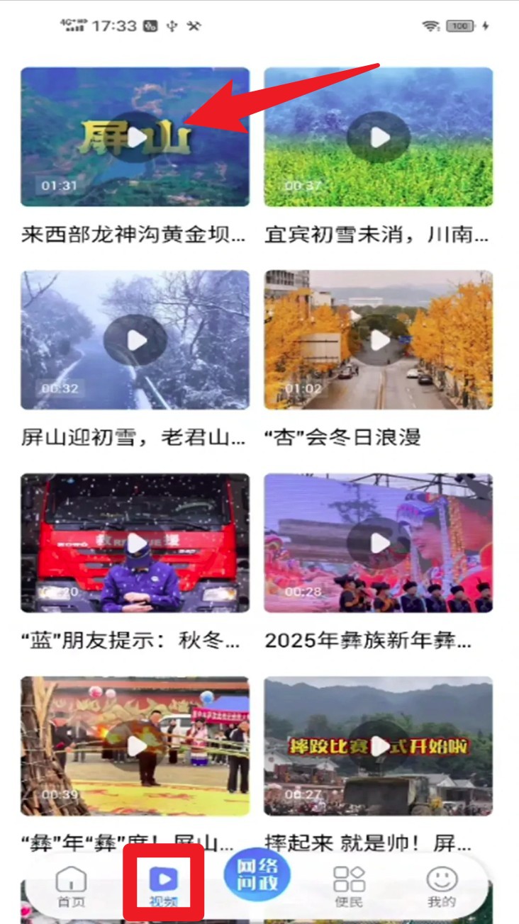 2. 切换到底部视频页签,浏览屏山本地文化、风景、人文活动等短视频内容,支持点击播放。