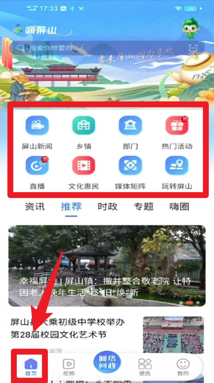 1. 进入首页可查看屏山新闻、乡镇、部门等栏目,快速获取本地资讯与各类便民服务入口。