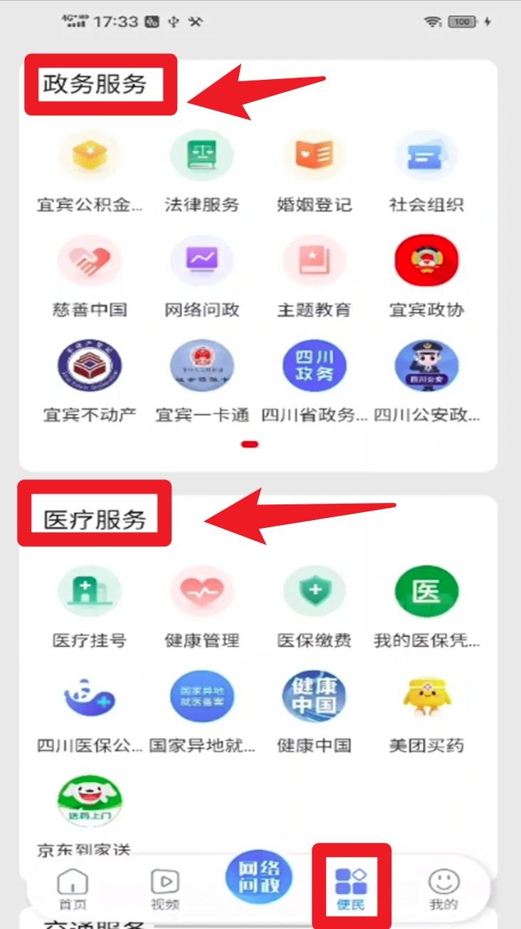 3. 点击下方便民页签,可使用政务服务、医疗服务功能,如医保缴费、法律服务、健康管理等。