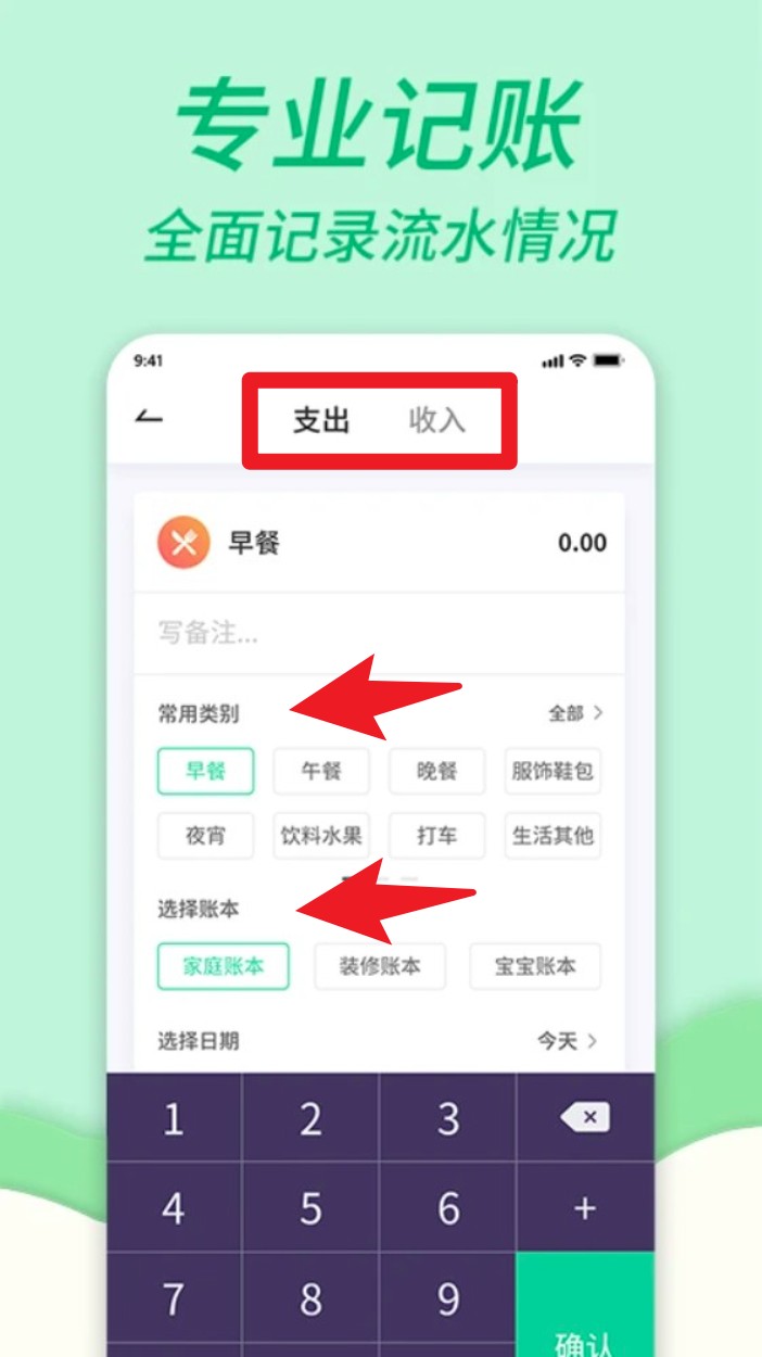 4. 点击新增账目时可选择支出或收入,选择类别与账本后输入金额,系统自动整理进账本中,记录过程高效简洁。