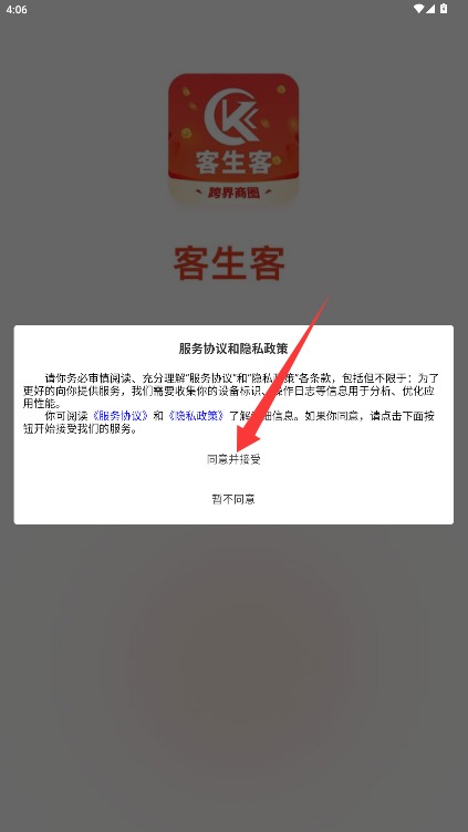 1、初次使用需阅读用户服务协议与隐私政策,确认后点击同意并接受选项进入应用。