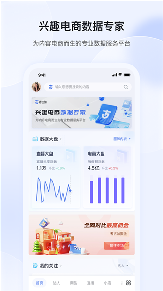 考古加数据平台app是一款专注于抖音直播电商数据的分析平台,在这里,不仅可以很好地帮助你轻松查看分析抖音直播达人的数据,并在商品选择上同样进行重点关注,实时监控全品类商品数据趋势变化,让你能够充分挖掘到优秀的带货主播,打造热门的爆款带货商品,而且可以检测每个直播带货时间的各种客流、人流量以及带货数据,同时会十分准确的以报表的形式为你进行展示,一目了然让你可以方便做出相应的对策。