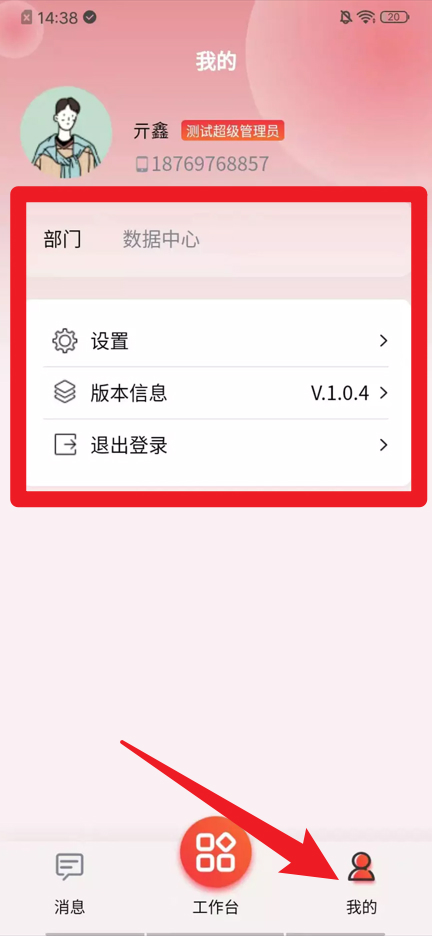 5、个人中心页面展示用户基本信息、所属部门、版本信息等内容,同时可进行设置调整或安全退出登录。