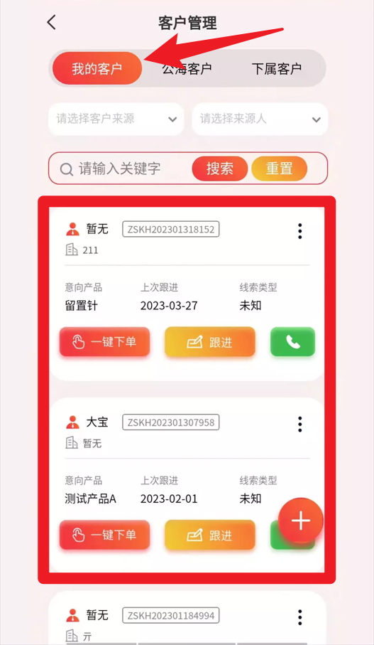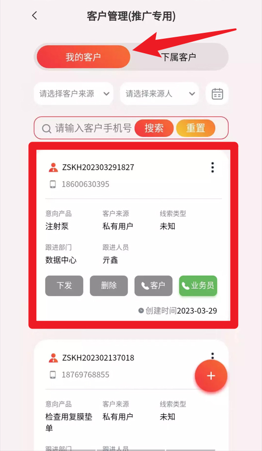 3、客户管理界面支持查看我的客户和下属客户,还能通过搜索与筛选快速定位目标客户,提升工作效率。