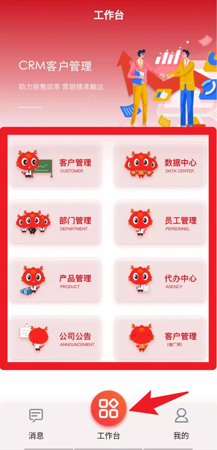 2、在工作台页面,可以直观查看客户管理、数据中心、部门管理、员工管理等模块,快速进入对应功能操作。