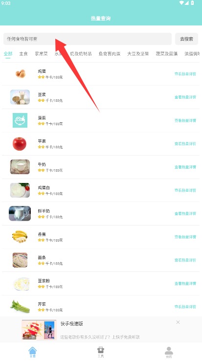 2、在热量查询页面中输入食物名称,点击搜索按钮获取相关食物营养数据。