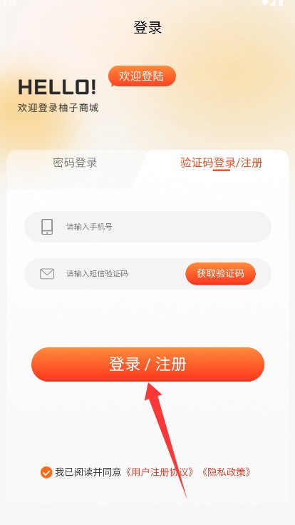 2、在登录页面输入手机号和验证码,勾选同意相关条款后点击登录、注册进入应用。