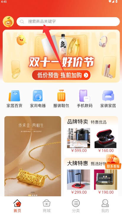 3、在首页商城顶部搜索栏输入商品名称或相关关键词,搜索需要的商品进行浏览。
