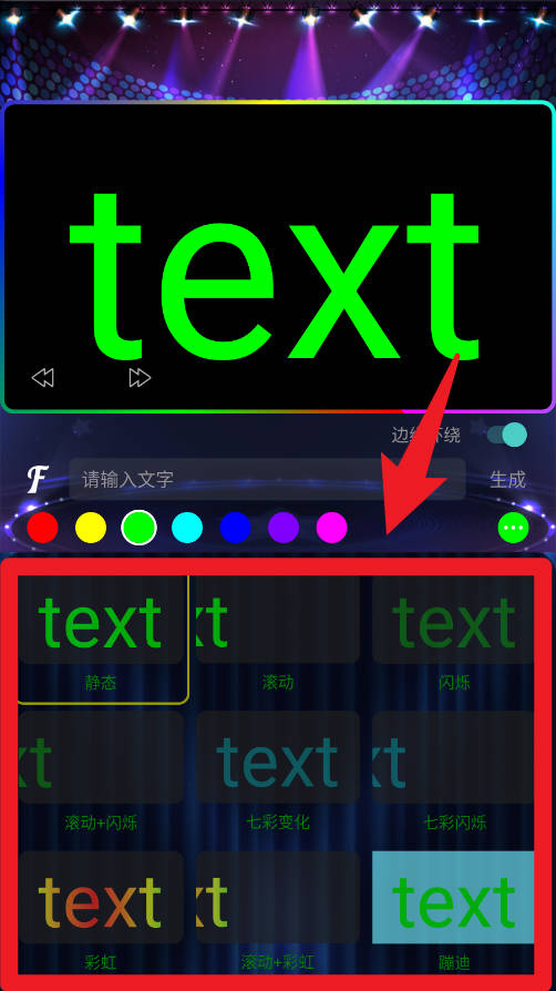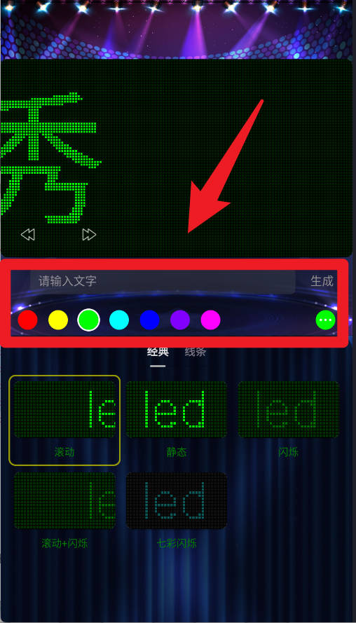 2、在画面中,可以先输入需要显示的文字,并选择底部提供的多种颜色,点击生成即可快速创建LED显示效果。