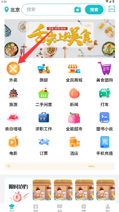 2、在应用首页导航栏中找到外卖服务功能入口,点击进入餐饮商家列表展示页面。