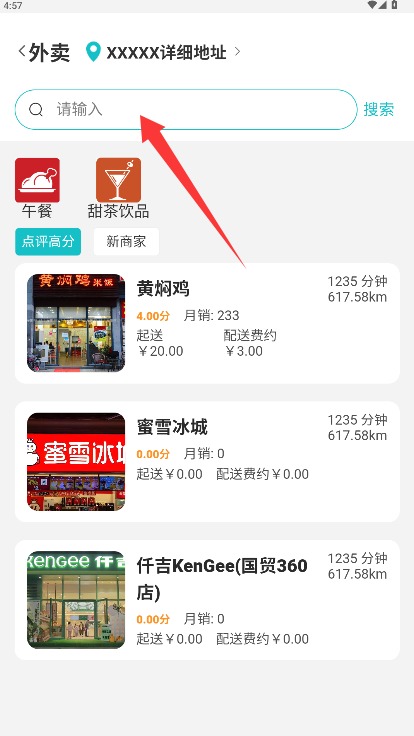 3、通过顶部搜索栏输入商家名称或菜品关键词,快速查找目标餐饮店铺与特色美食内容。