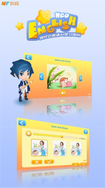 《NeoEnglish》是现代教育出品的AI英语云学习软件,目标用户是5~8岁的现代教育在校学员,配合线下课程My World使用。通过访问学习中心、电影院、音乐厅、图书馆、演讲台等趣味功能模块,用户可以对英语进行听说读写全方位的学习,搭建良好的英语知识体系。除此之外,系统会对用户的行为与表现进行数据管理与分析,并自动生成学习报告。