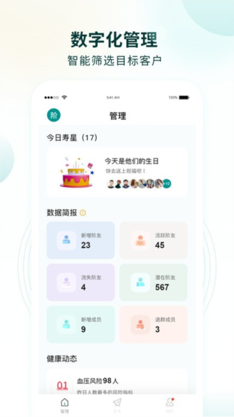 智能的AI分析,实时的健康风险预警,帮助全程掌握客户健康动态,快速分析客户画像及精准锁定客户需求,定向发布健康资讯,精准推荐个性化解决方案,提升个人综合专业度和客户满意度,实现客户价值最大化。