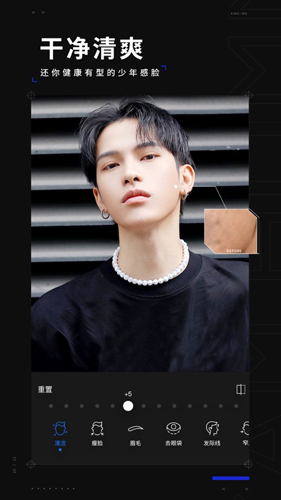 实时预览的面部清洁、健康肤色、有型轮廓。脸部细节微调修饰,还原你少年感的真实效果。