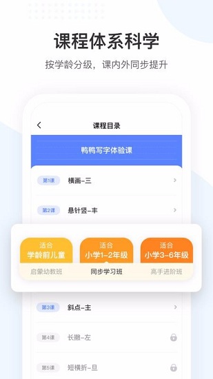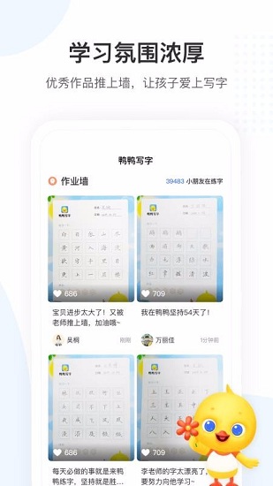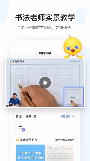 鸭鸭写字APP是一款由北京美唐科技有限公司打造的儿童书法练习软件。该软件提供线上学习、录播课程等学习服务,让孩子们可以随时随地,想学就学,不在局限时间、环境的影响,快速提高孩子们的书法水平。