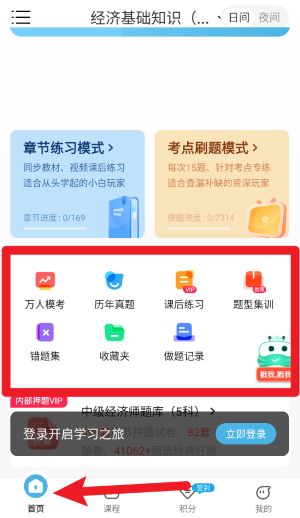 2、首页功能区提供万人模考、历年真题、课后练习等多个模块供用户自主刷题学习。