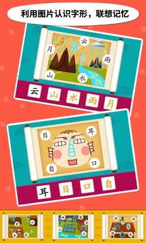 2、通过图文结合的方式展示汉字结构,利用画面元素帮助儿童加强识字记忆力。