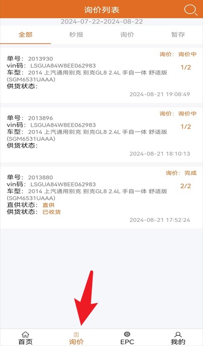 4、点击底部菜单栏中的询价按钮,可查看全部订单的询价状态和处理进度。