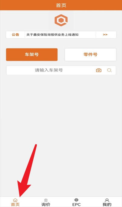 3、成功登录后进入首页,可通过输入车架号快速查询所需配件信息和公告通知。
