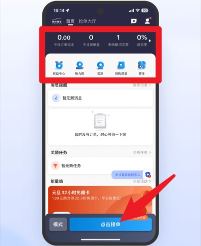 3、首页展示今日订单、收入等信息,点击点击接单按钮可开始抢单。