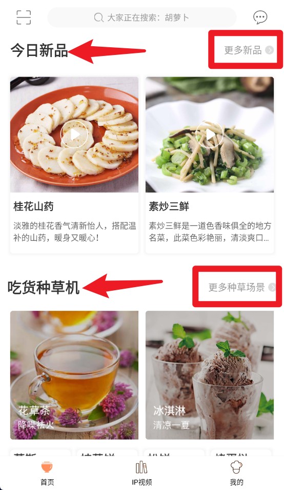 2、今日新品与吃货种草机分区展示,点击更多新品或更多种草场景可查看更多推荐美食。