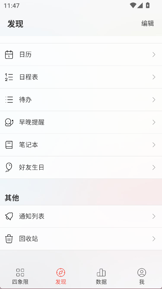 2、发现界面能查看更多功能,如日历、待办等