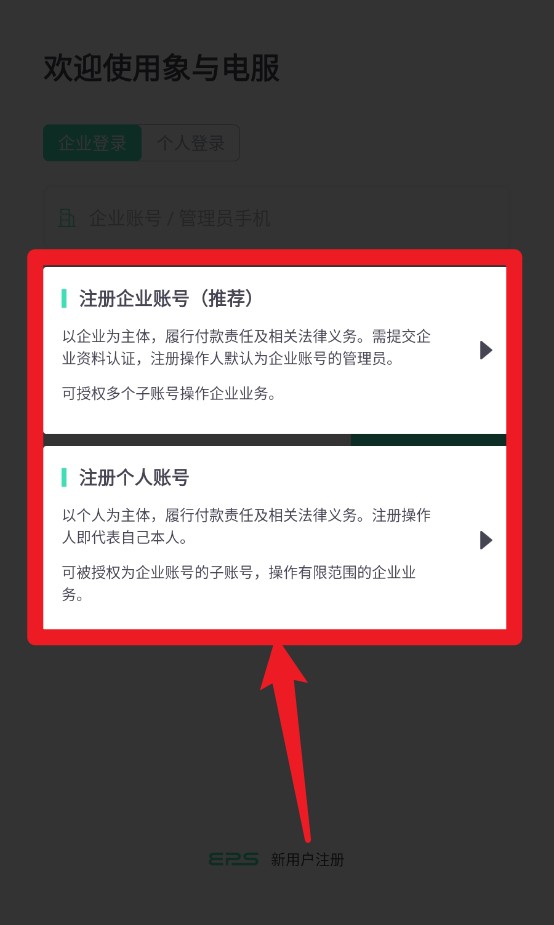 2、点击新用户注册可选择注册企业账号或个人账号,企业账号适用于管理权限较多的用户。
