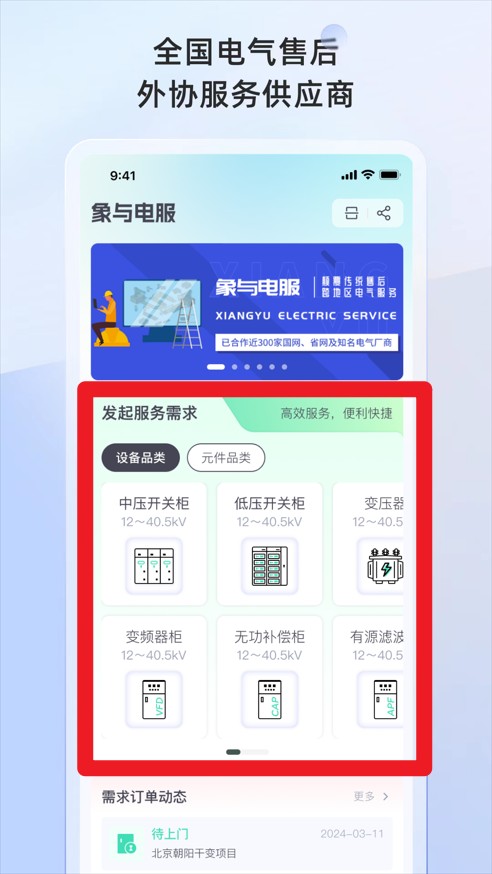 3、登录后进入首页,可根据设备类型快速发起服务需求,如变压器、低压开关柜等项目。