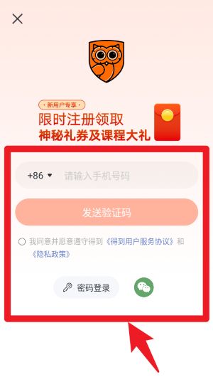 1、打开得到App后,可通过输入手机号并点击发送验证码完成账号注册流程。