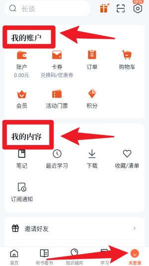 5、点击未登录页面,可进入个人中心,可点选我的账户或我的内容,查看卡券、订单信息、最近学习等。