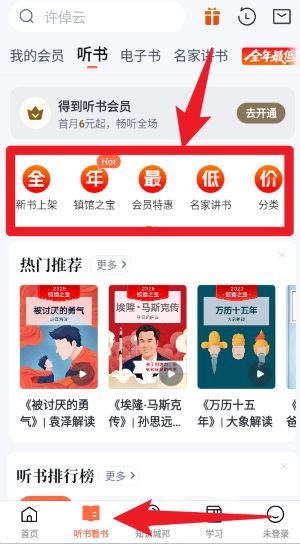3、点击下方听书看书,可进入听书专区,享受全年最低价的会员优惠及分类资源。