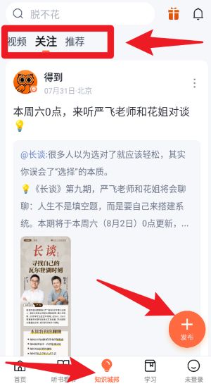 4、点击知识城邦可发布动态,可切换视频、关注、推荐三类内容进行浏览。