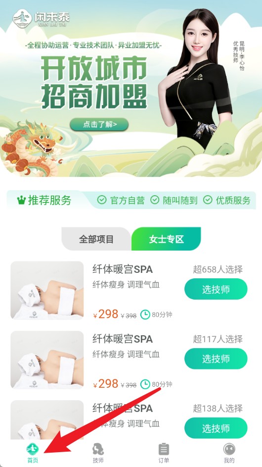 2、登录成功进入首页,页面展示热门SPA项目与价格,可点击首页按钮返回此页面。