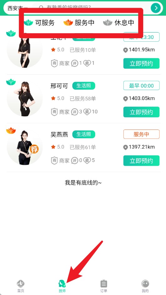 3、点击底部技师菜单,查看可服务、服务中及休息中的技师状态和距离,便于选择预约。