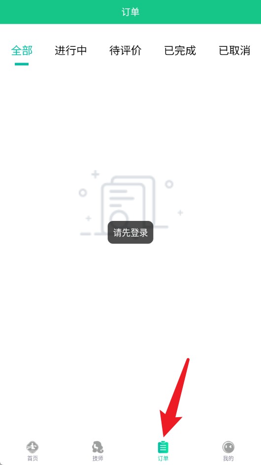 4、点击底部订单可查看所有订单状态,需先登录才能查看进行中、待评价等订单记录。