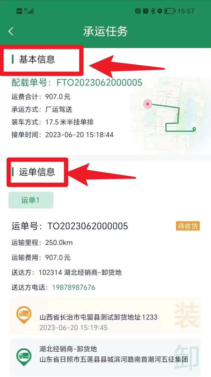 3. 进入任意一条承运任务详情页,查看基本信息与运单信息,包含运费、装车方式及收货地址等。