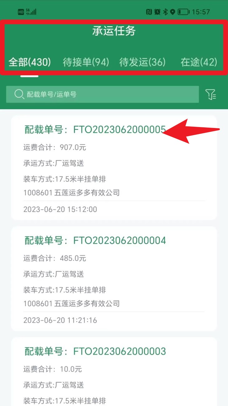 2. 登录后点击首页导航栏中的承运任务模块,查看全部任务列表及对应的配载单号等详细信息。