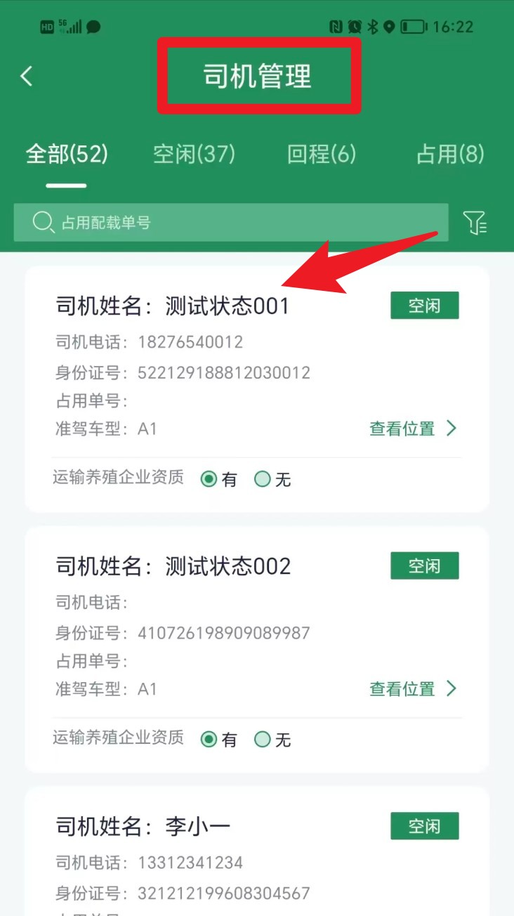 4. 在导航栏选择司机管理即可查看所有司机信息,包括当前状态、联系电话、准驾车型与是否有运输资质。