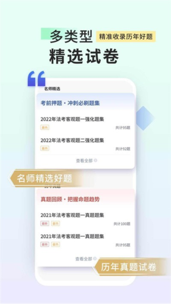 海量历年真题:精选往年考试真题,把握2022年法考备考规律,快速掌握司法考试必考知识点。历年真题在线练习,掌握历年考试趋势,快速提分。