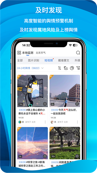 提供小视频原发内容及评论的监测、预警、搜索、分析、研判等服务;支持火山、西瓜、秒拍、快手、抖音、全民小视频、哔哩哔哩、美拍等主流平台;数据主要通过关键词与视频标题或简介匹配的方式获取。