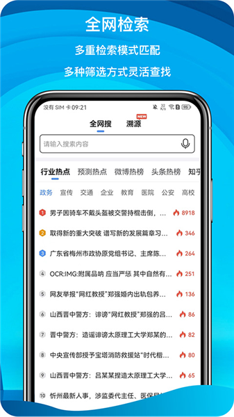 2. 在首页上方“全网搜”栏中输入关键词,系统将快速匹配多种信息源供用户查看。