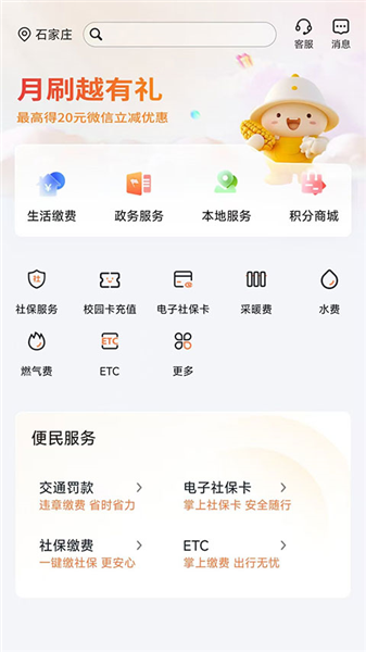 生活中的“生活缴费”可以完成部分地区的有线电视费、河北非税电子化缴费、供暖费、交通罚款的缴费。点击生活缴费,从下级菜单中选择缴费内容。