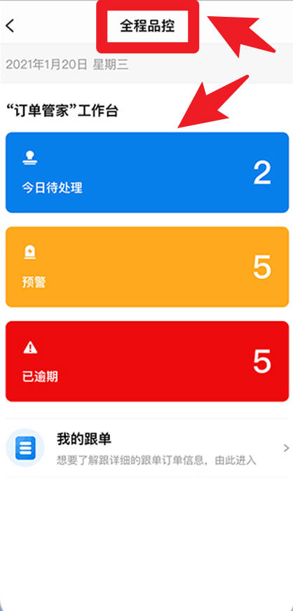 4、全程品控模块提供订单工作台,展示今日待处理、预警及已逾期的订单情况,帮助用户实时跟踪管理。