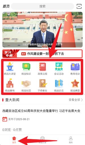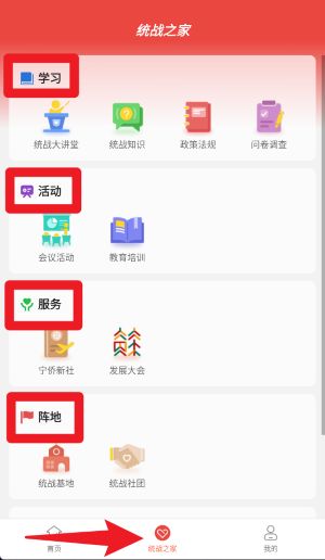 5、统战之家界面中分类清晰,按学习、活动、服务、阵地等场景归类,方便用户快速定位所需栏目并进行操作。