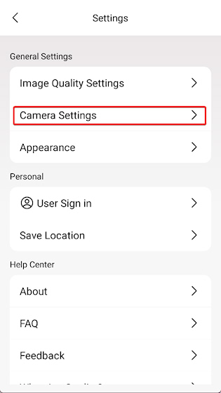 1、在首页点击右上角齿轮按钮,然后选择 camera settings 进入相机设置中
